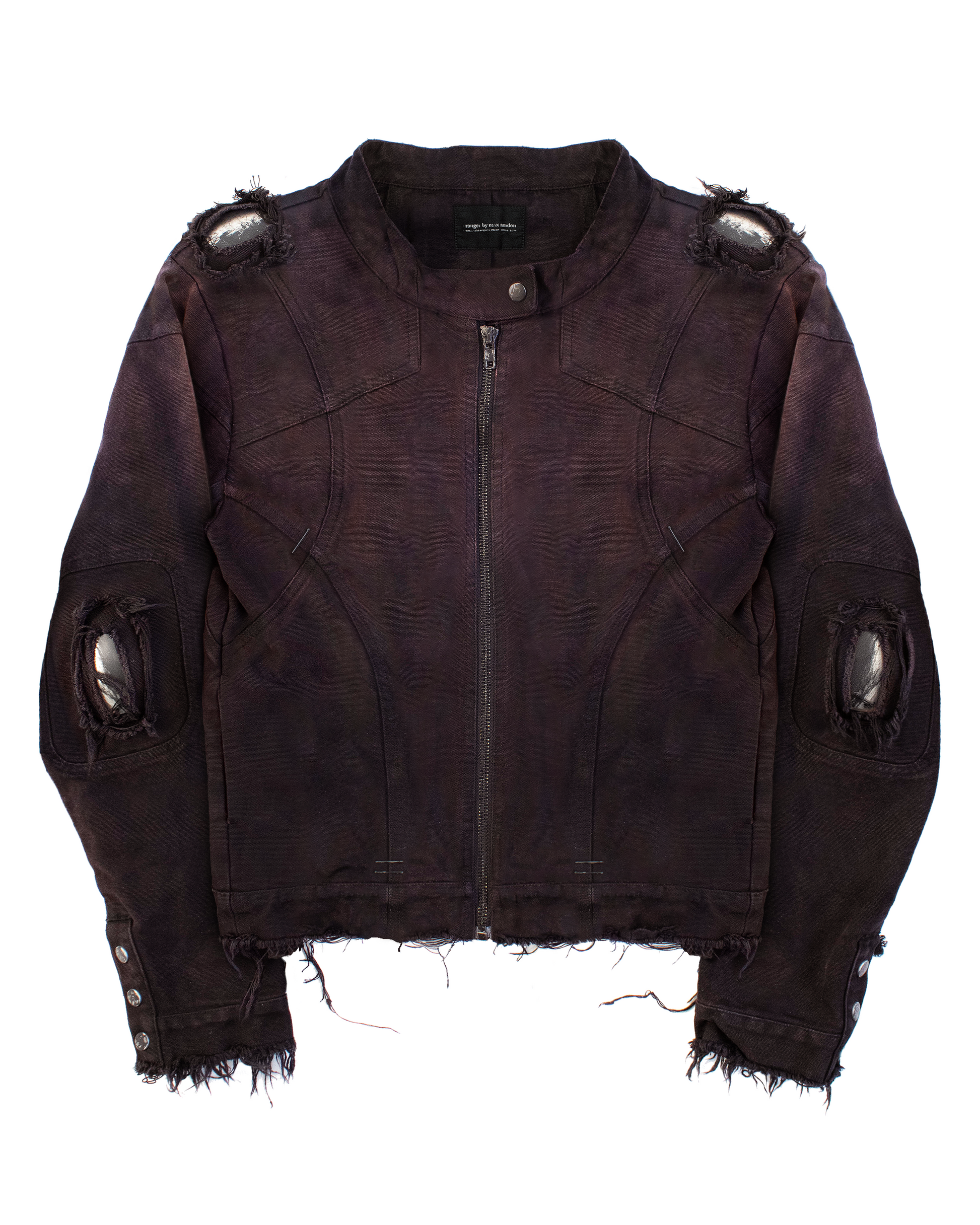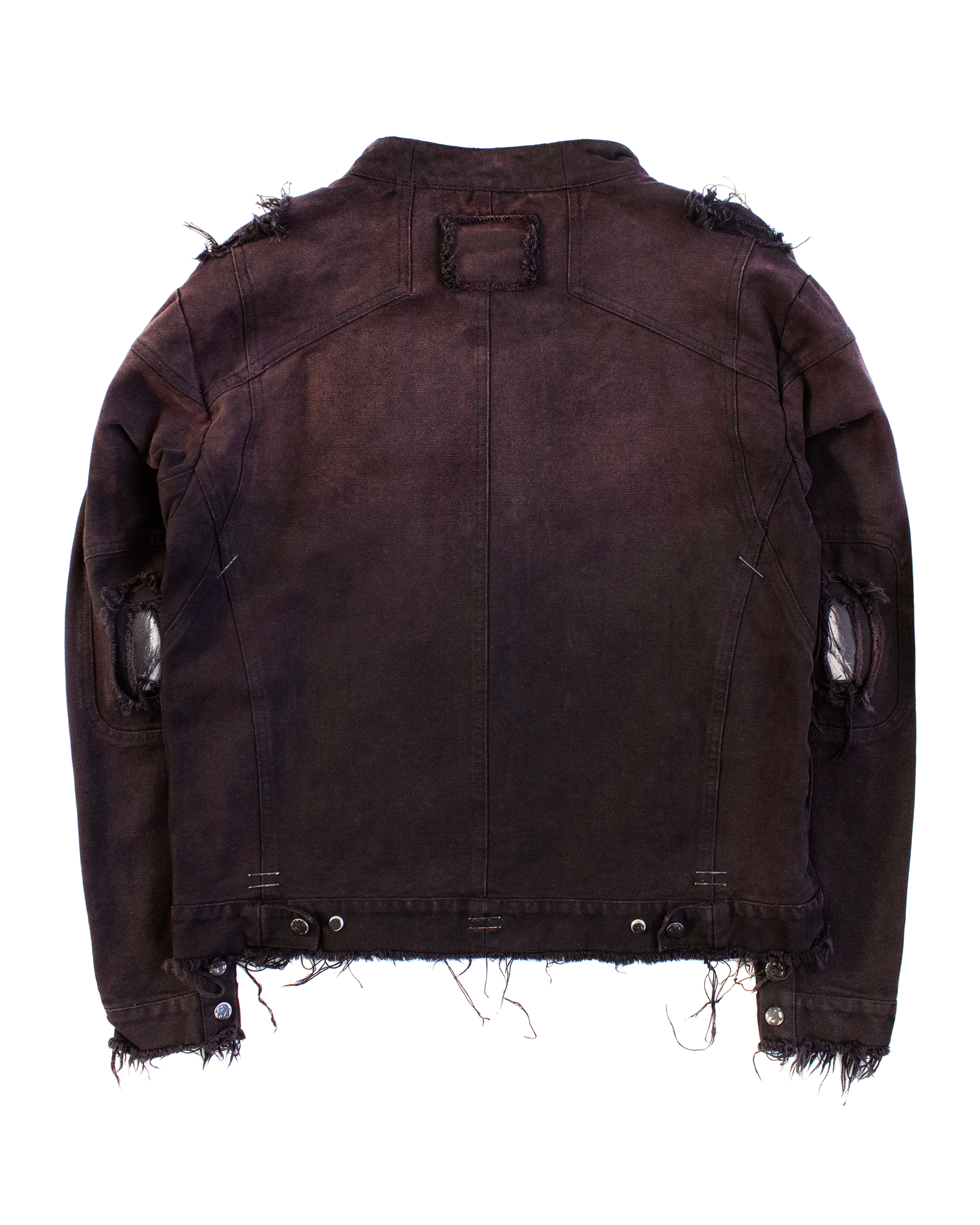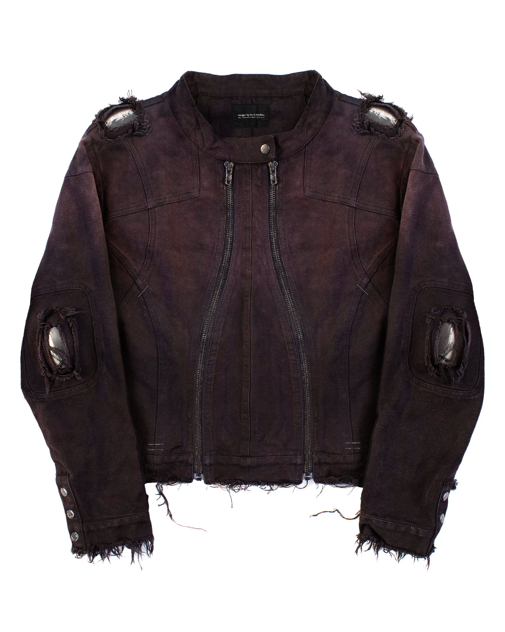 the ‘r.Armor canvas jacket’ is constructed from 100% cotton canvas, has undergone a beautiful garment wash across the whole piece, and dyed a deep maroon color. the jacket features four ‘r.Armor’ waxed pads, each pad detachable for additional styling options and variety. hand waxed staples can be located around the hem and pits. two asymmetrical zippers run up the frontside of the jacket, and unzip a removable flap, creating a tighter fitting look and style.